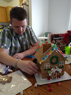 Last year, we tried to make a gingerbread house, and it didn't go too well. This year, there were no plans to try that again. But then Costco sold a kit (with a pre-made house!), and Chase begged. This was definitely much better than last year :) Chase really got into it. And so did Marcus.